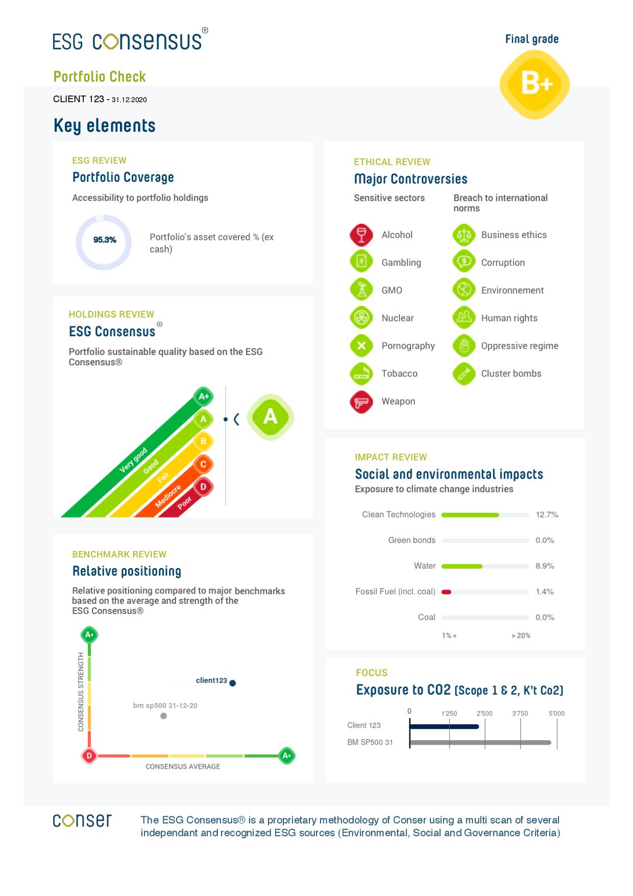 100% dedicated to responsible investment, Conser has developed a unique ESG digital tool to assess the sustainability profile and impact of portfolios. Our expertise is based on collective intelligence which captures the most relevant ESG voices of the industry.